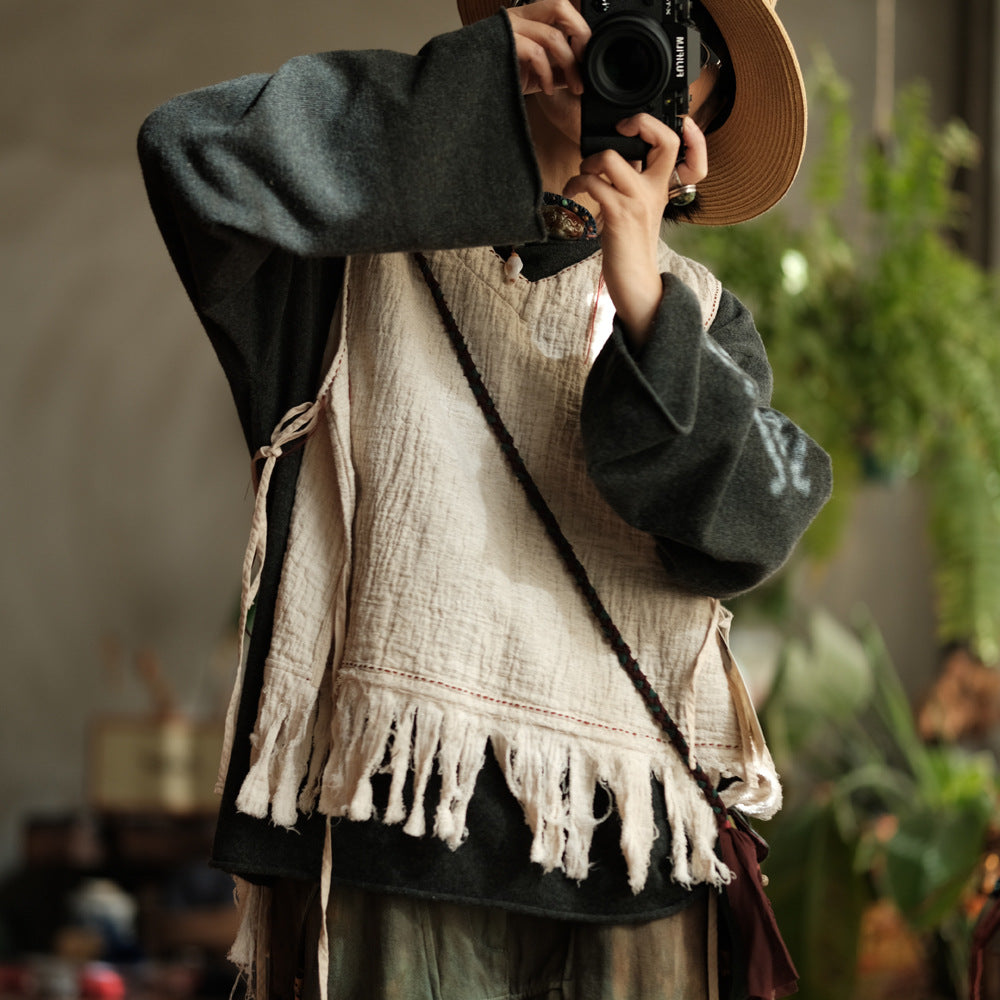 Destacada por su textura de lino natural y detalles bohemios, la blusa de lino Boho Breeze ofrece elegancia y comodidad. Su escote en V, complementado con borlas laterales, le da un toque dinámico, mientras que su tejido ligero y transpirable garantiza comodidad durante todo el día.