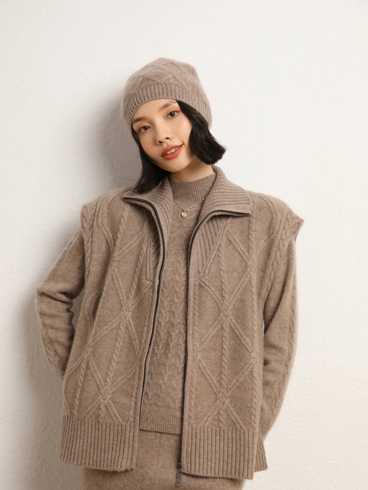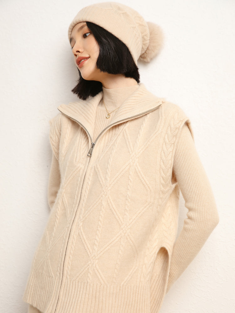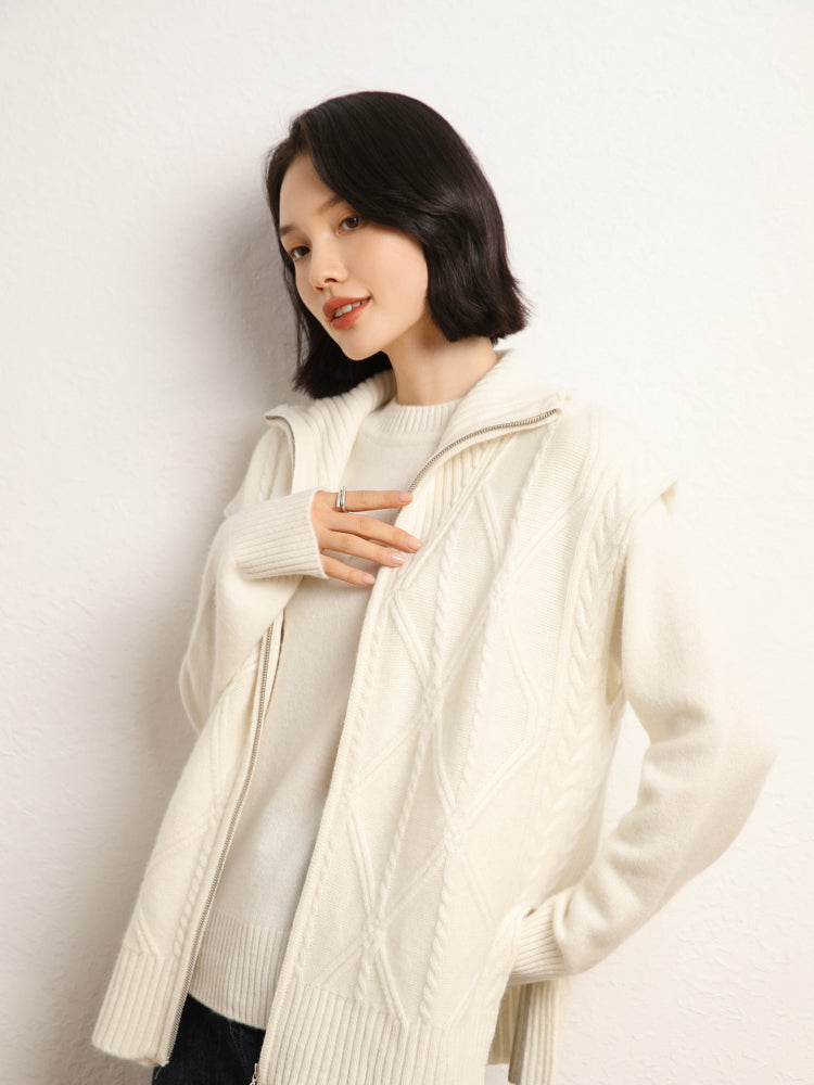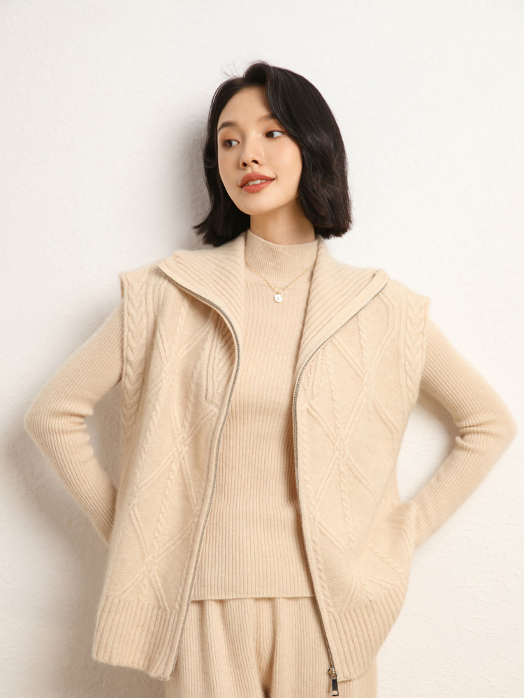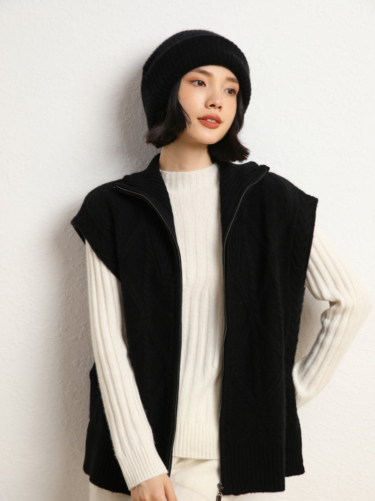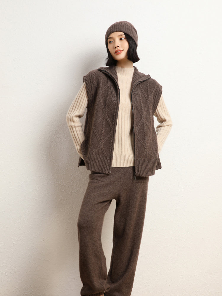 El chaleco de punto de lana de cachemira combina elegancia y comodidad con su mezcla de 35 % cachemira y 65 % lana, que ofrece suavidad y calidez. Con un patrón de punto clásico, diseño sin mangas y un práctico cierre de cremallera frontal, es elegante y funcional. Con su ajuste de talla estándar, este chaleco es perfecto para usar en capas en días fríos y complementa cualquier atuendo sin esfuerzo.