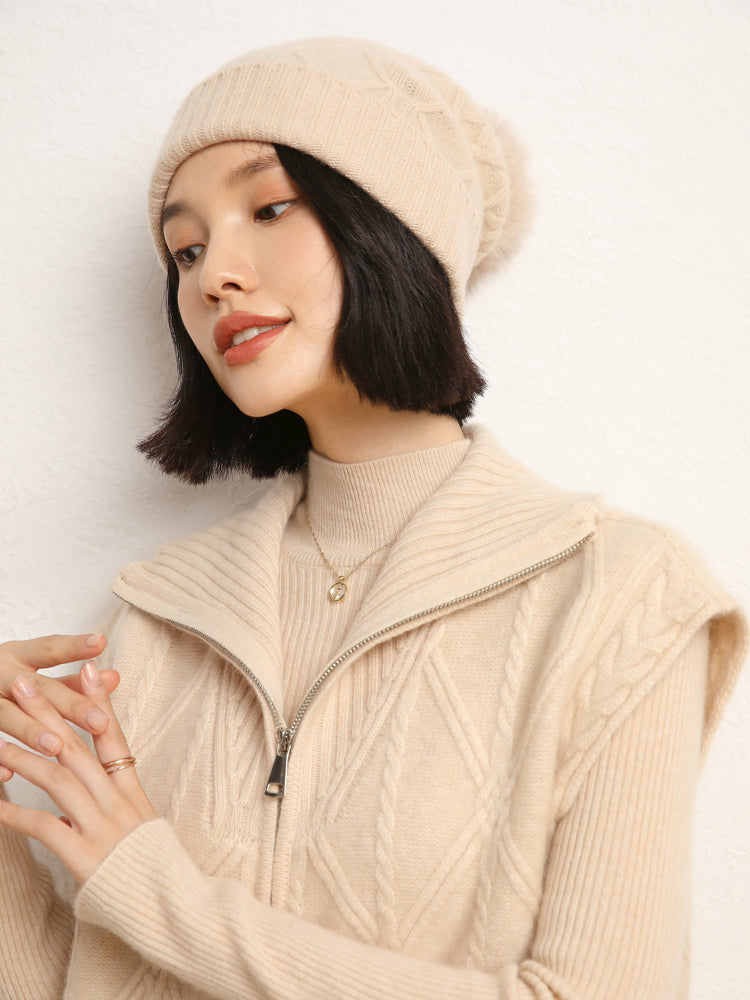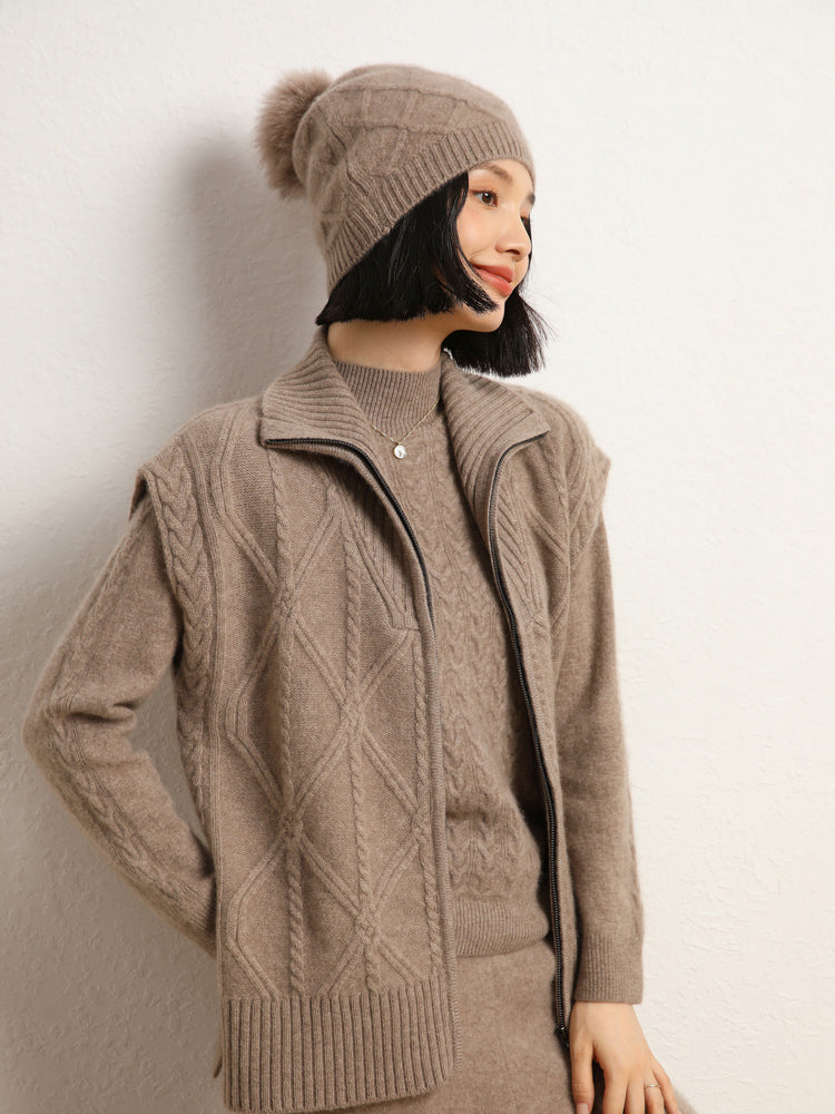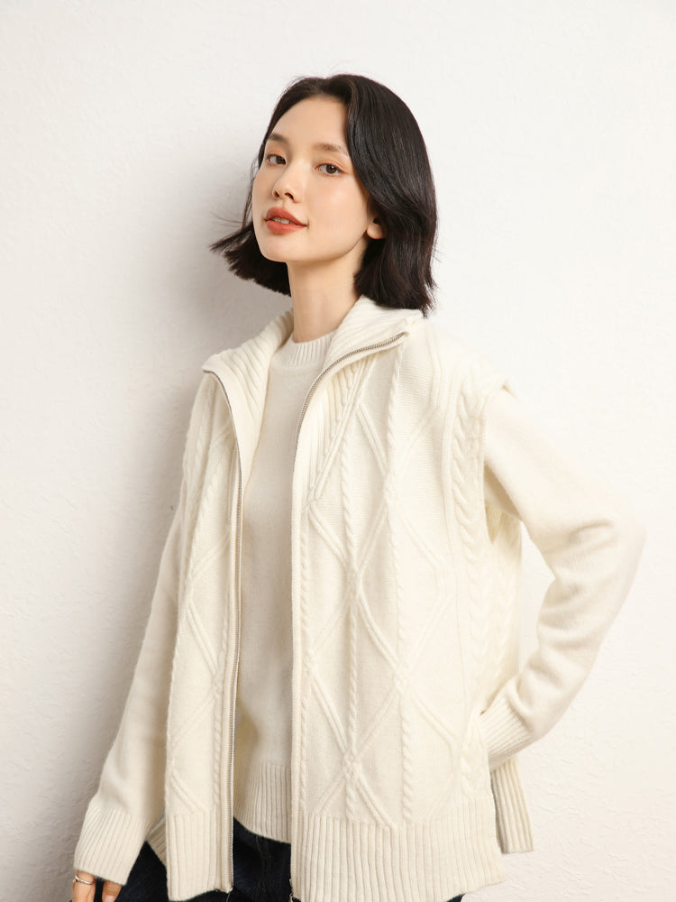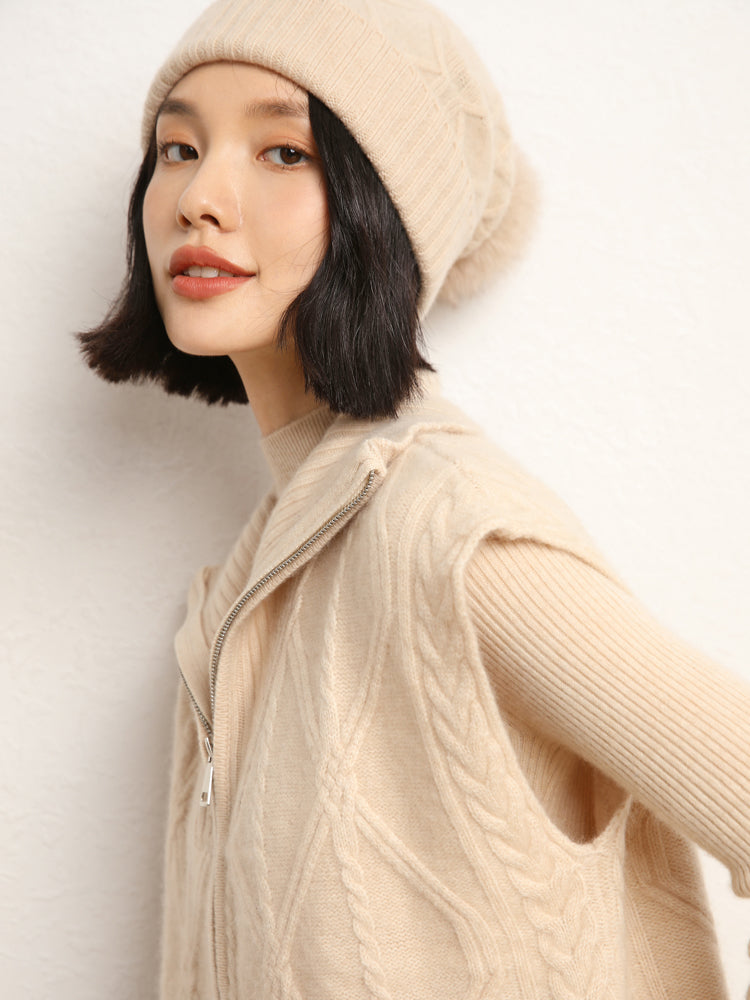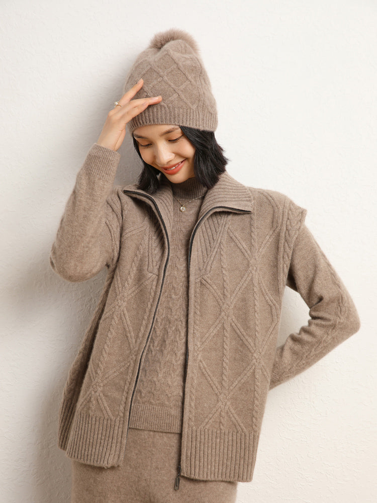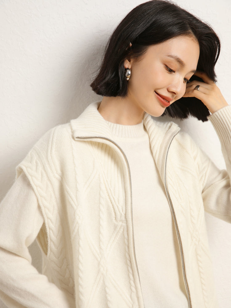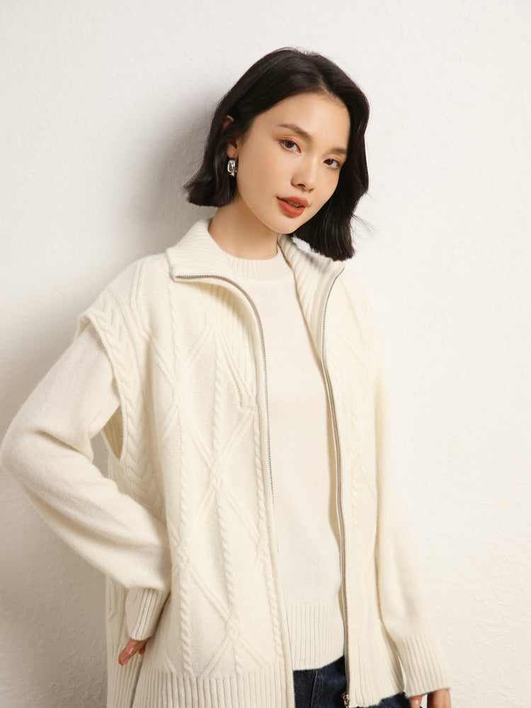 El chaleco de punto de lana de cachemira combina elegancia y comodidad con su mezcla de 35 % cachemira y 65 % lana, que ofrece suavidad y calidez. Con un patrón de punto clásico, diseño sin mangas y un práctico cierre de cremallera frontal, es elegante y funcional. Con su ajuste de talla estándar, este chaleco es perfecto para usar en capas en días fríos y complementa cualquier atuendo sin esfuerzo.