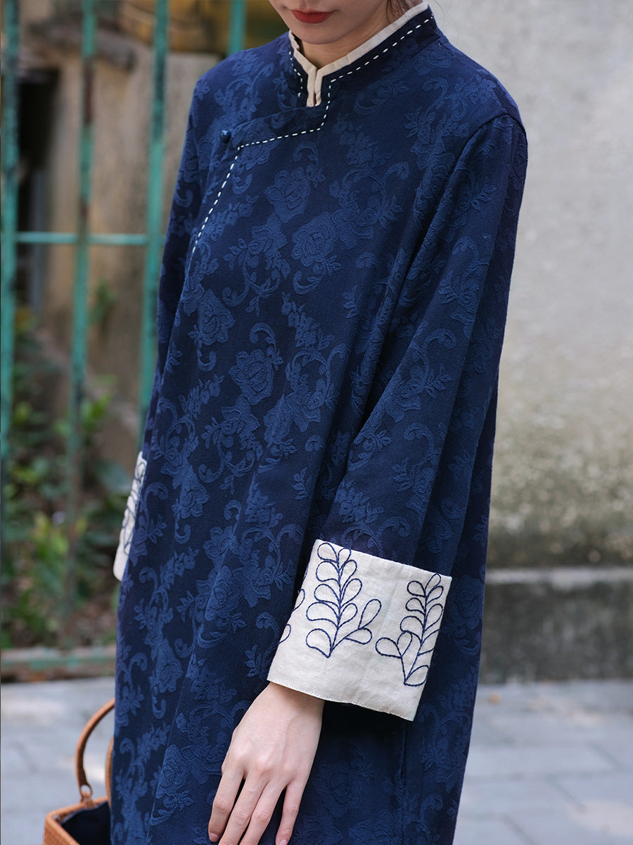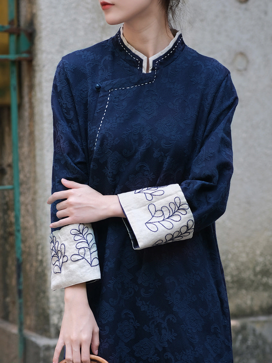 Esta elegante túnica está confeccionada con una mezcla de algodón y lino jacquard, con un sofisticado color beige y puños azul marino en contraste. El bordado de flores de eucalipto en los detalles de las mangas le agrega un toque refinado y natural al vestido túnica. Con un diseño de inspiración asiática, esta pieza es lo suficientemente versátil tanto para uso diario como para eventos especiales. Combinando elegancia clásica con detalles modernos, esta túnica aportará una sofisticación única a tu estilo.