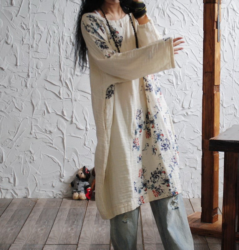 Confeccionada en 100 % algodón , esta versátil prenda presenta delicados estampados florales que aportan un toque primaveral a tu armario . Con cuello redondo y mangas largas , ofrece comodidad y encanto . Su corte holgado permite usarla como túnica o vestido , lo que la hace ideal para cualquier ocasión .