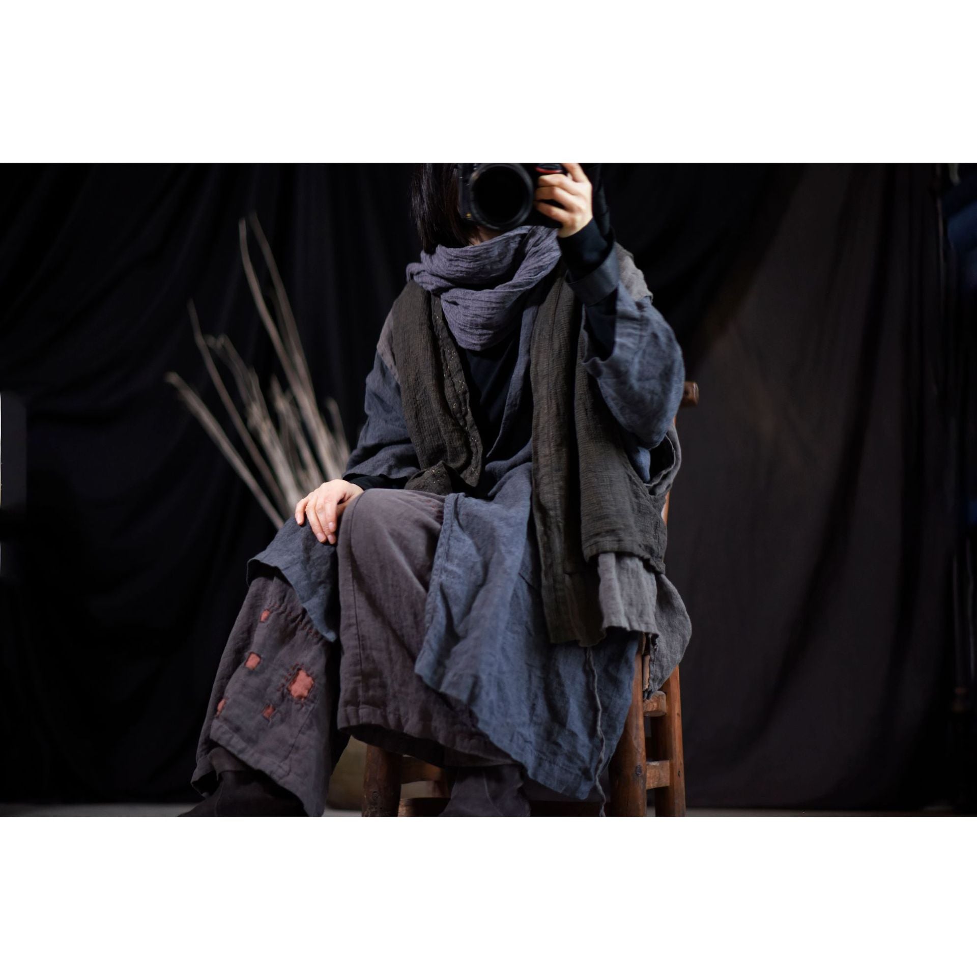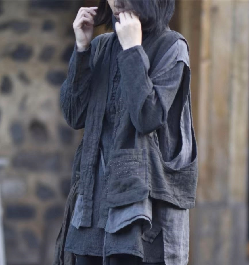 Este chaleco de inspiración vintage está confeccionado en una mezcla de algodón y lino con un diseño de doble capa. Los prácticos detalles de los bolsillos le añaden encanto, convirtiéndolo en una prenda elegante y versátil para combinar con otras prendas.