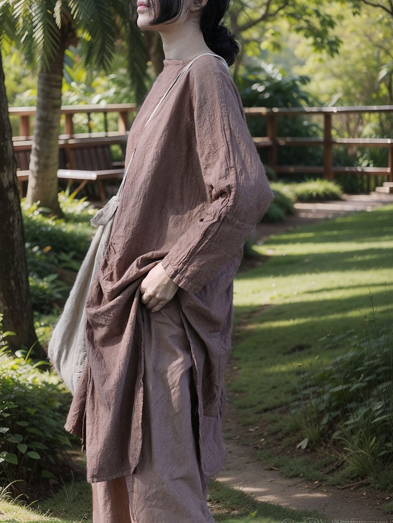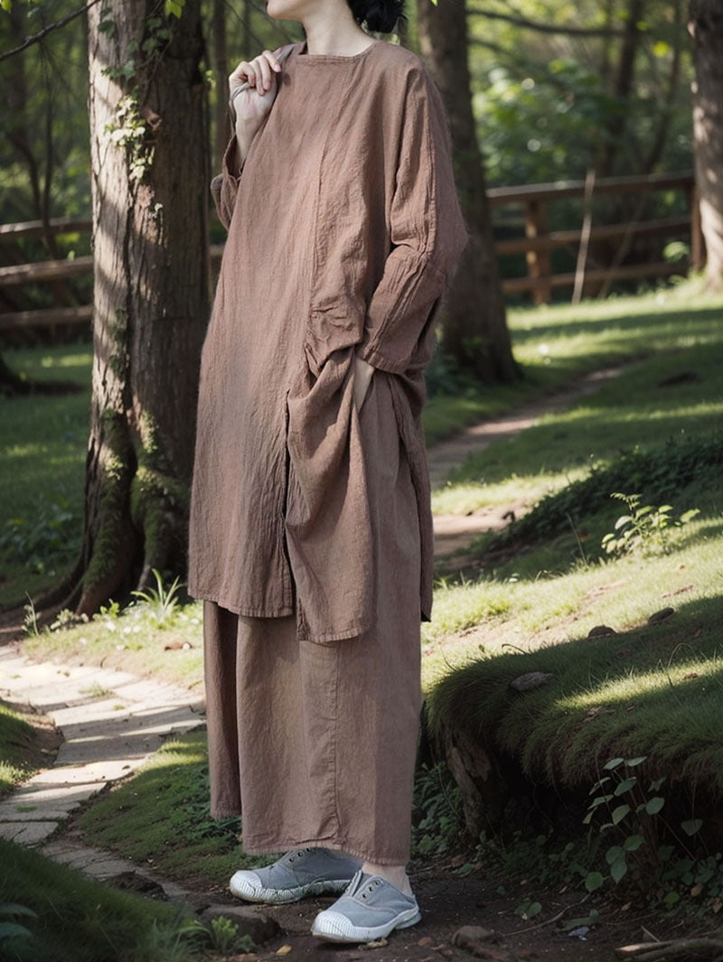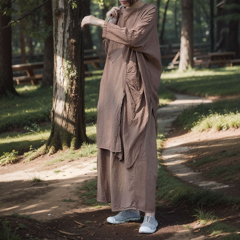 Esta blusa larga de corte holgado está confeccionada en tejido transpirable de algodón y lino. Con aberturas delanteras y traseras y un clásico escote redondo, ofrece un estilo elegante y desenfadado.