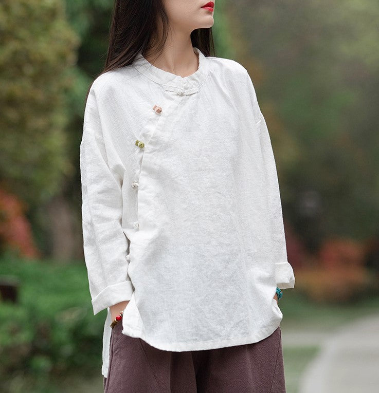 Descripción: Presentamos la blusa de lino y algodón Lotus, que aporta la elegancia oriental a tu armario. Esta blusa, confeccionada en tejido de lino y algodón, ofrece comodidad durante todo el día gracias a su estructura transpirable. Las mangas largas y el diseño de cierre asimétrico presentan influencias asiáticas tradicionales. Los botones de lino colorido añaden un toque auténtico a la blusa. Disponible en talla estándar, esta blusa ofrece un aspecto elegante y chic tanto para uso diario como para ocasiones especiales.