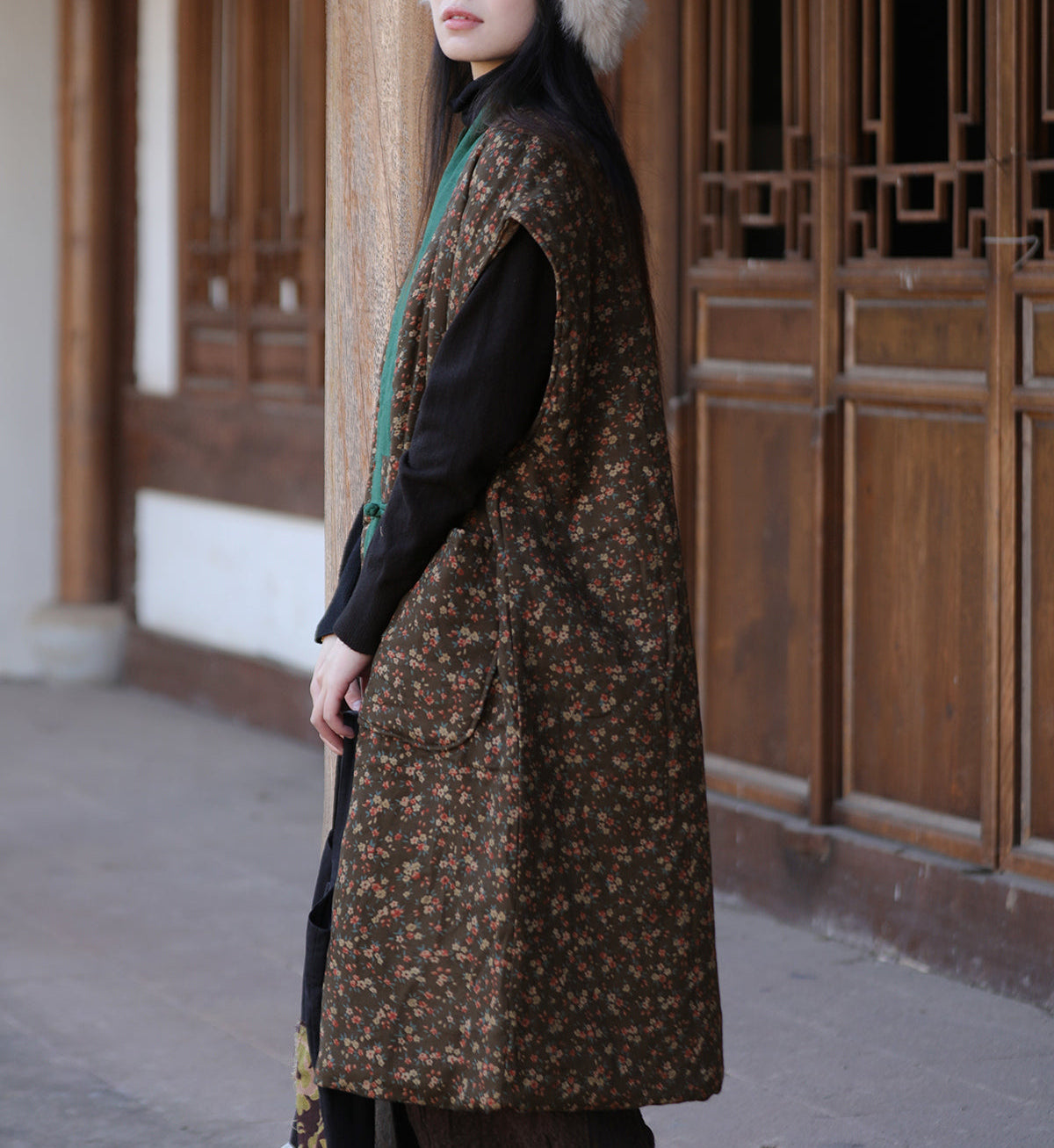 Con exquisitos botones tallados que simbolizan el arte tradicional, este chaleco acolchado sin mangas une el pasado y el presente con elegancia. Los estampados de estilo étnico reflejan la herencia cultural y aportan carácter a los conjuntos de diario. Su corte holgado lo hace versátil, perfecto para llevar solo o sobre prendas de punto, vestidos o blusas de manga larga.