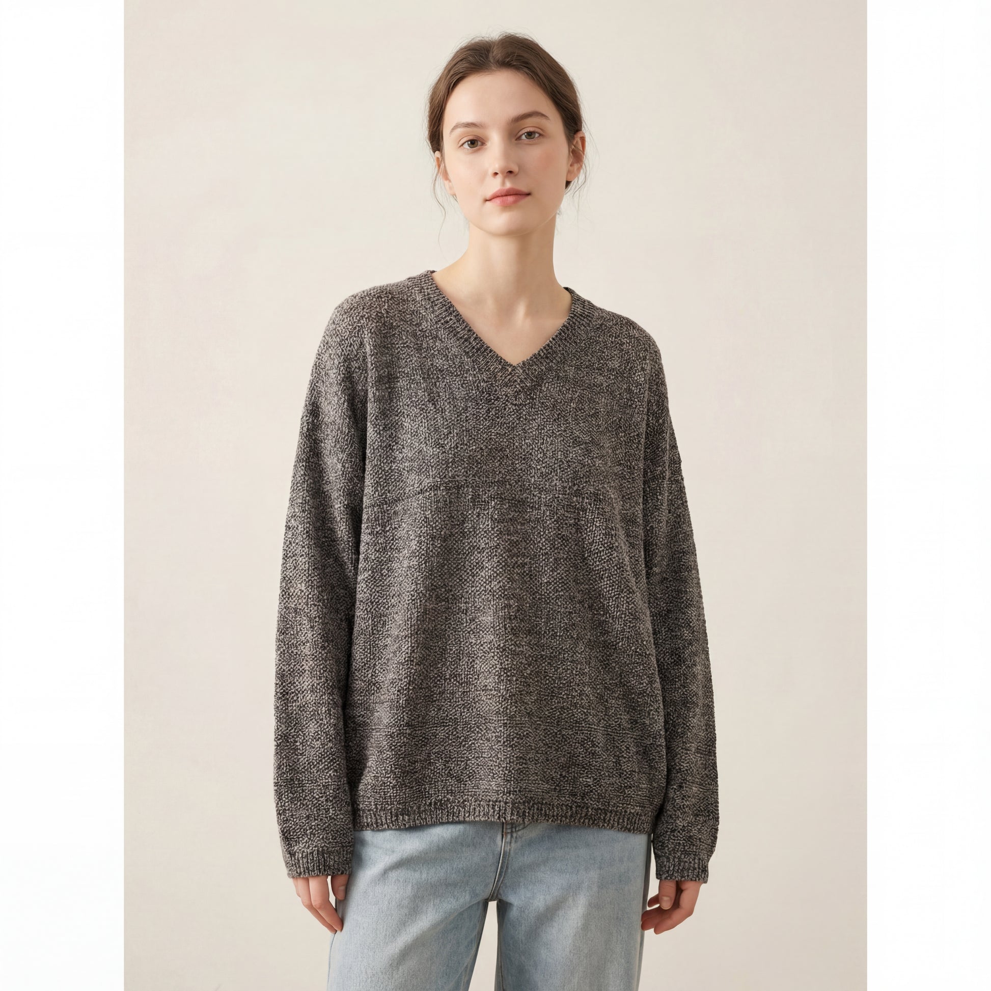 El suéter de punto oversize vintage casual con cuello en V está diseñado para la comodidad diaria con una silueta clásica y relajada. Con un escote en V pronunciado y un corte holgado oversize, crea un look sencillo y favorecedor, ideal para todas las estaciones.