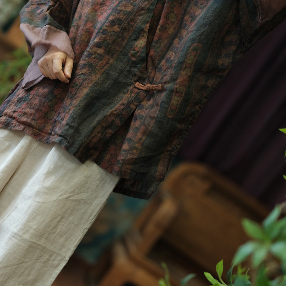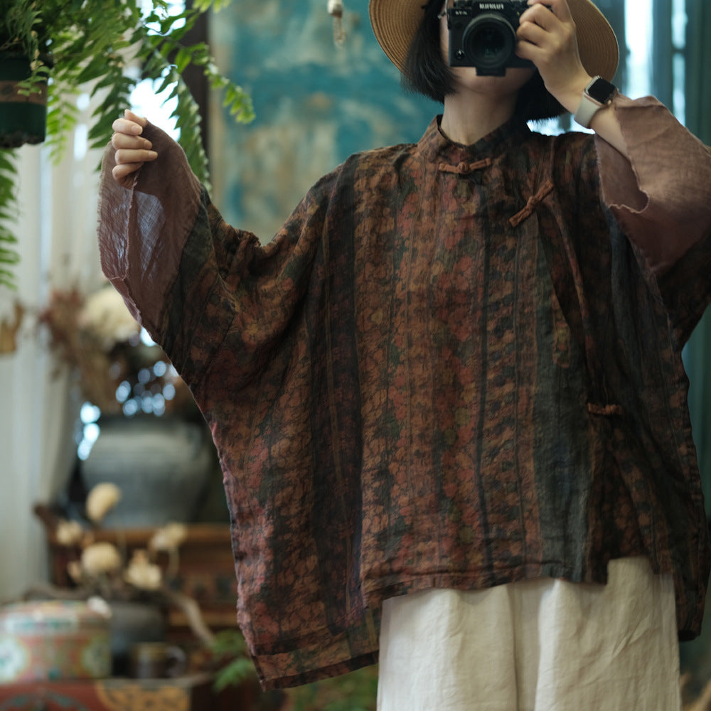 La blusa Vintage Earth Rami combina los cálidos tonos de la naturaleza con la refinada textura de su tejido 100 % rami. Ligera, transpirable y duradera, ofrece comodidad durante todo el día, luciendo intrincados estampados terrosos. Con su corte holgado y sus tradicionales botones con nudo, esta blusa es perfecta tanto para la elegancia informal como para looks de inspiración vintage.