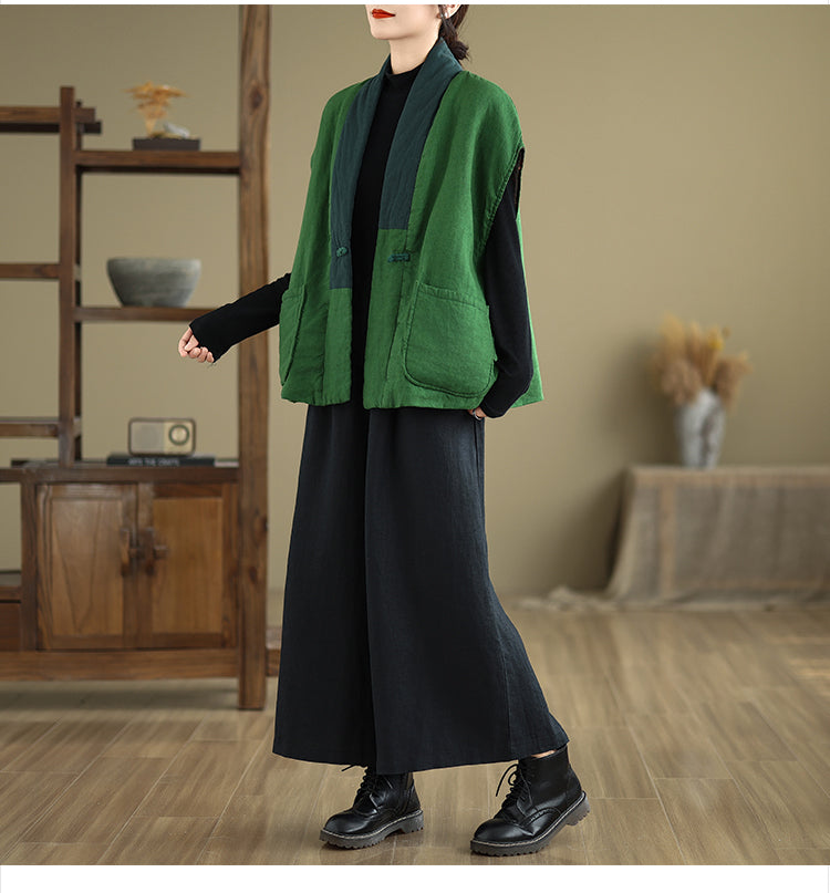 En relajantes tonos verdes y textura vintage, esta chaqueta complementa a la perfección tanto conjuntos casuales como especiales. Una opción perfecta para quienes valoran la comodidad y los tejidos naturales, combinando practicidad con una estética refinada.