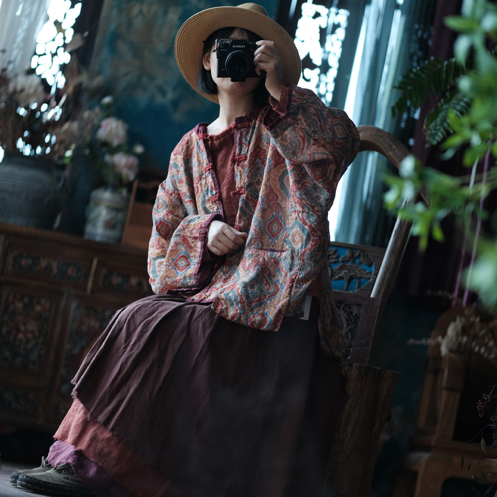 Esta chaqueta de lino de inspiración vintage añade un toque único a tu estilo con dos opciones con estampados florales y étnicos. Con prácticos bolsillos laterales y cierres de botones recubiertos de tela, combina funcionalidad con elegancia. Gracias a su textura de lino ligera y transpirable, esta chaqueta es perfecta para usar durante todo el año. Con una combinación de estética moderna y bohemia, se convertirá en una de tus prendas favoritas de armario.
