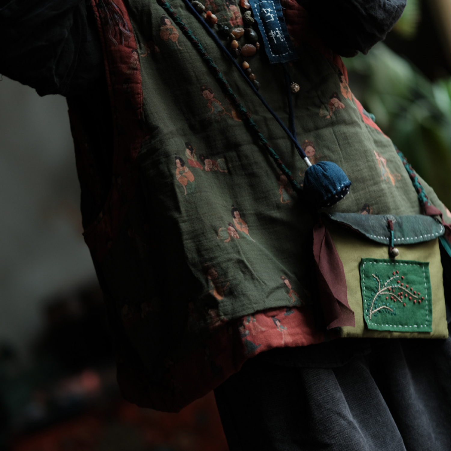 El bolso bandolera vintage patchwork bordado a mano captura el encanto de la artesanía y el espíritu del estilo vintage. Con una armoniosa combinación de tejidos en un diseño patchwork y un panel frontal delicadamente bordado a mano, es un accesorio artístico y funcional. Ligero y con correa ajustable, es perfecto para el día a día o para añadir un toque único a conjuntos especiales.