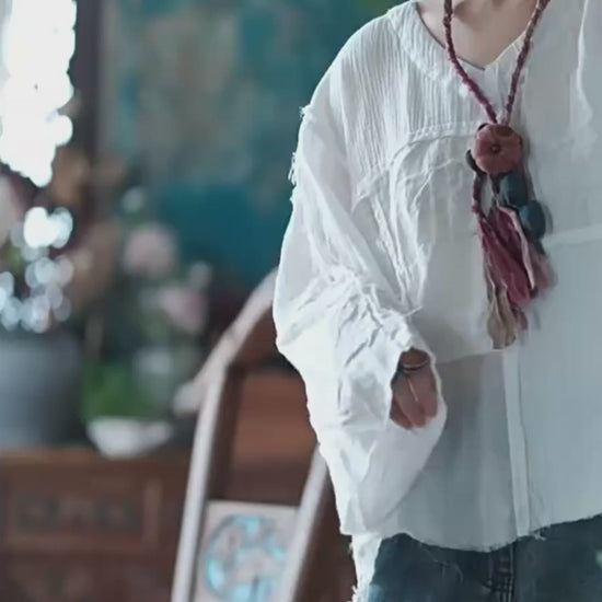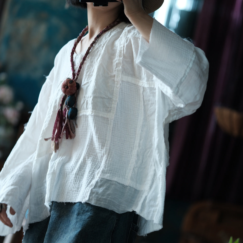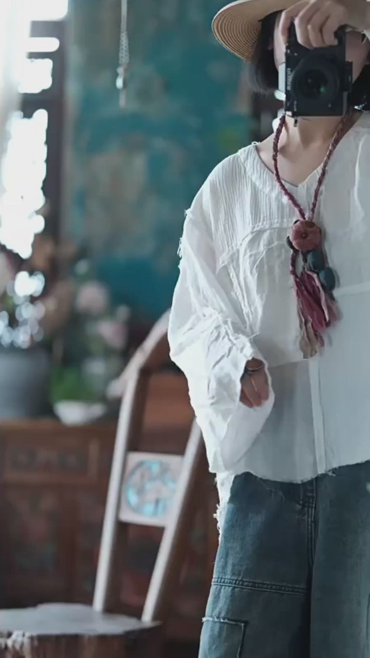 Elegante y ultracómoda, la blusa Vintage Patchwork con cuello en V está confeccionada en una mezcla transpirable de algodón y lino. Diseñada con un corte holgado y extragrande, presenta escote en V, mangas largas y detalles únicos de patchwork que le aportan un toque artístico. Su silueta fluida la convierte en la opción perfecta para el día a día.