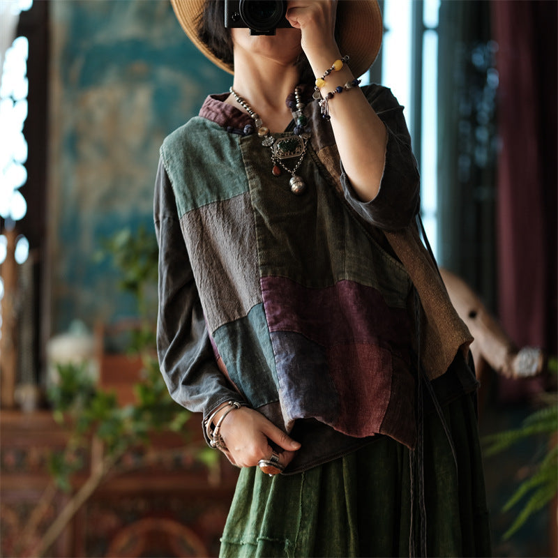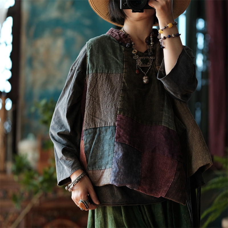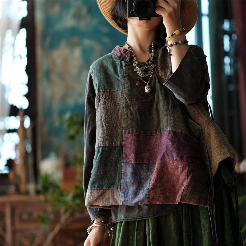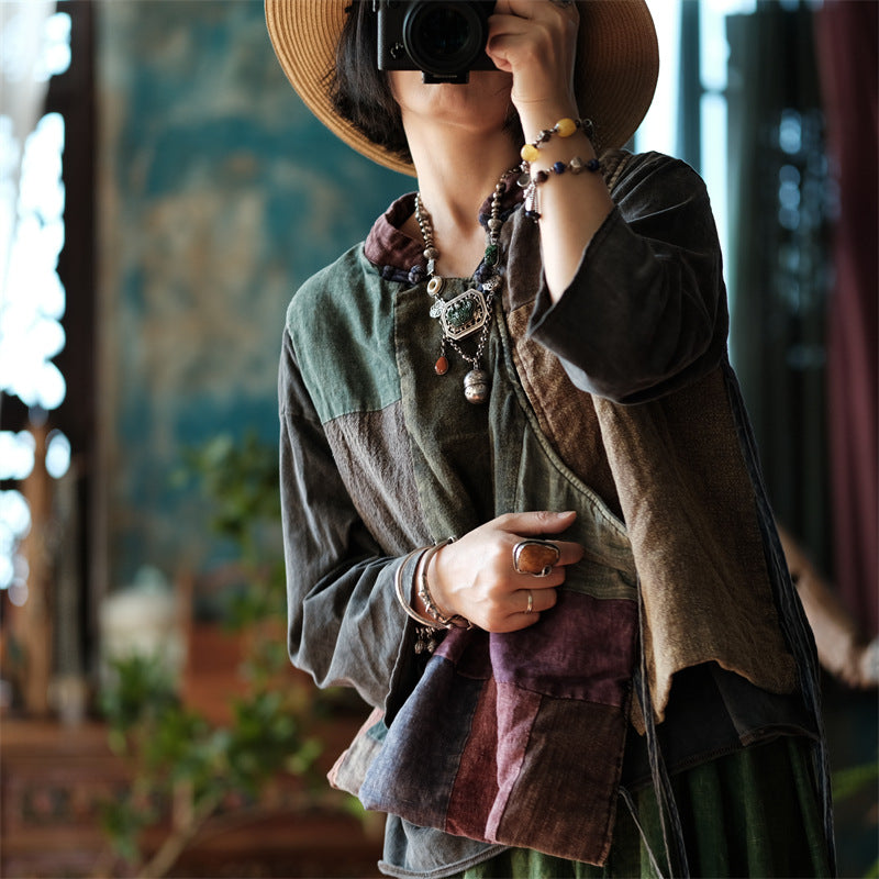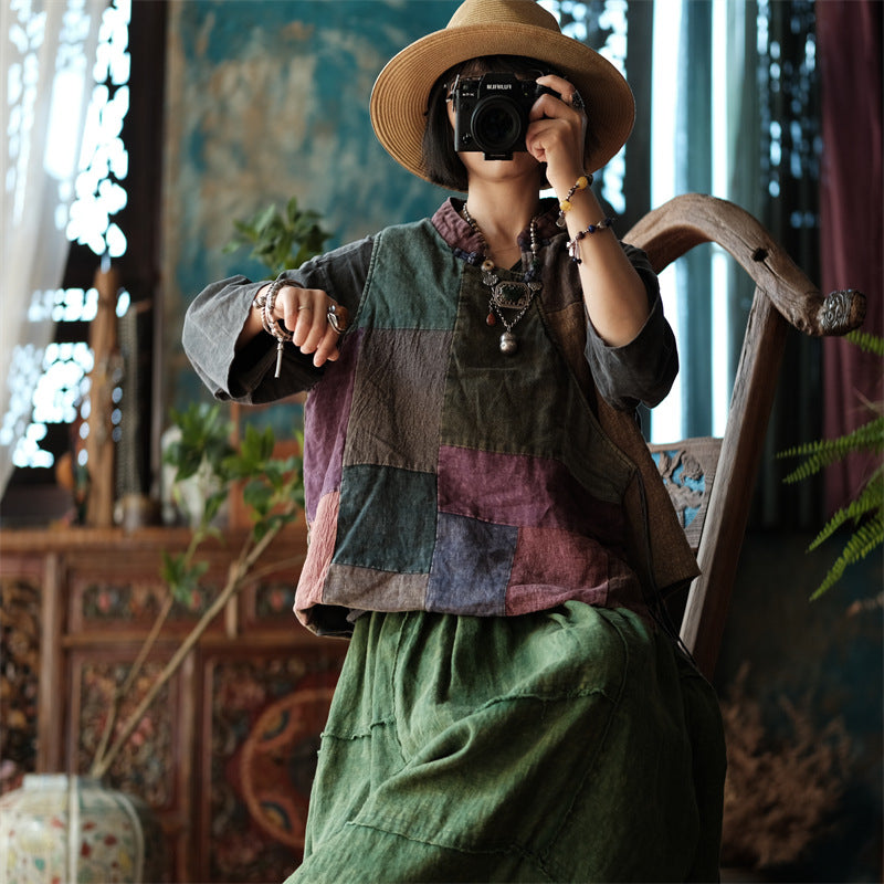 Este chaleco único está confeccionado con una mezcla de telas de lino en varios colores y patrones, combinadas con detalles de patchwork artesanal. El cierre de lazo envolvente agrega un toque de sofisticación clásica, lo que hace que este chaleco sea una pieza perfecta para completar tu estilo. Cada elemento acentúa su carácter vintage y resalta la textura natural del lino, ofreciendo comodidad y elegancia. Ideal tanto para uso casual como para ocasiones especiales, este chaleco seguramente se convertirá en uno de tus favoritos en tu guardarropa.