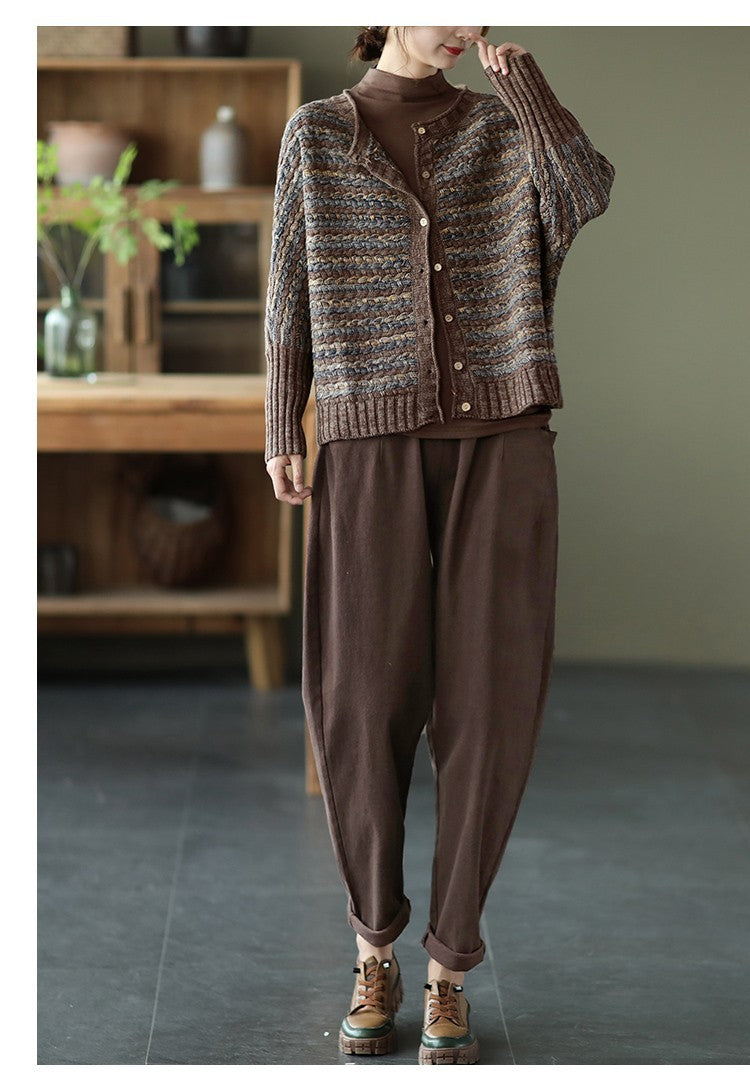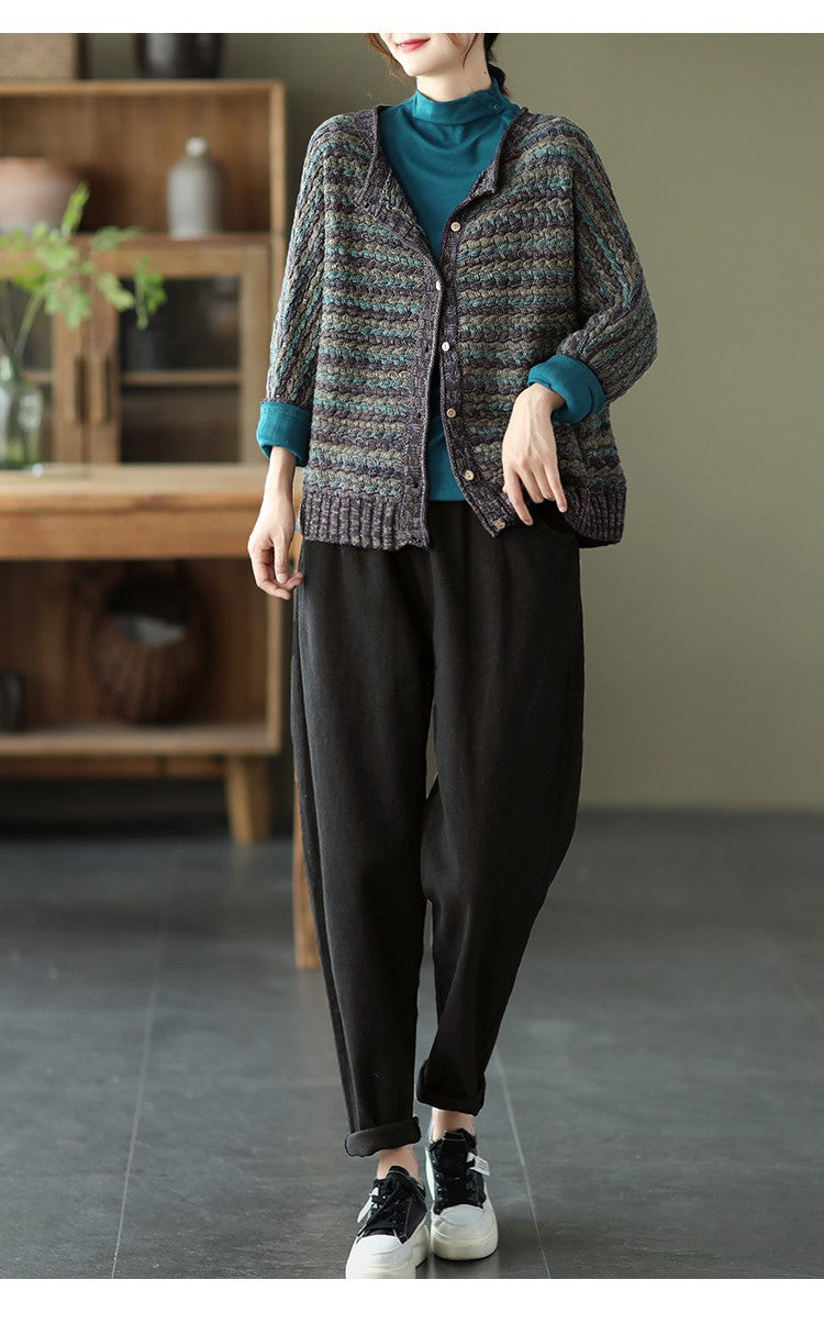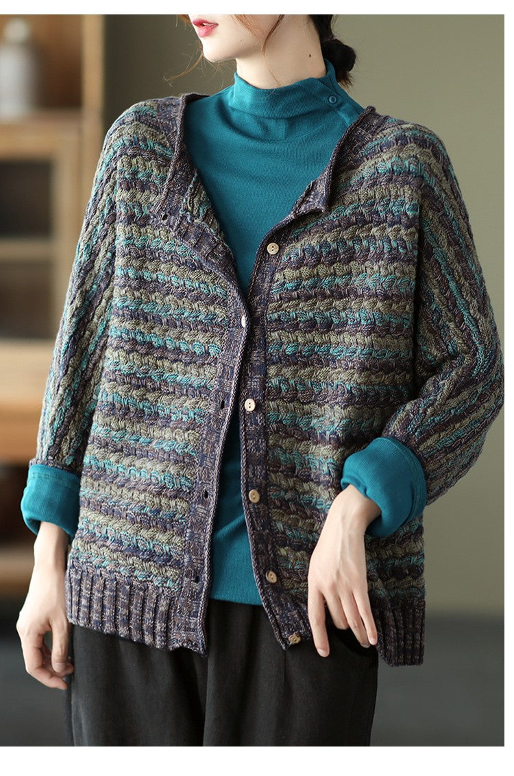 Combina el encanto retro con la elegancia moderna con el cárdigan de punto a rayas vintage . Con un diseño clásico a rayas y cuello redondo, ofrece estilo y comodidad. El cierre de botones garantiza su practicidad, mientras que su tejido ligero y suave te mantiene abrigado todo el día. Confeccionado con una mezcla de 55 % algodón y 45 % acrílico, este cárdigan es perfecto para cualquier temporada.