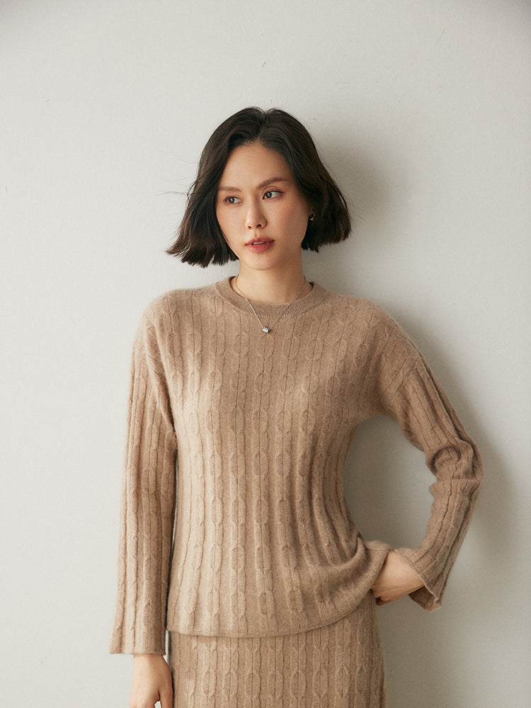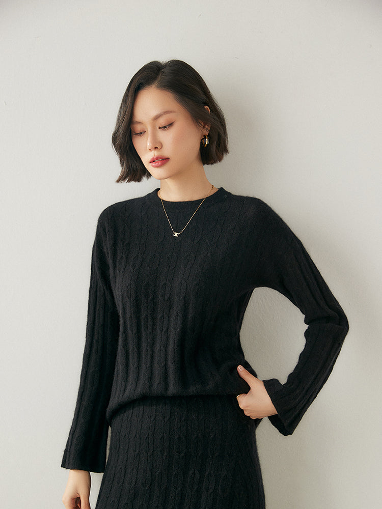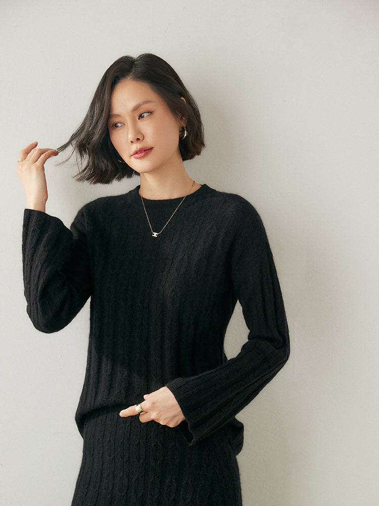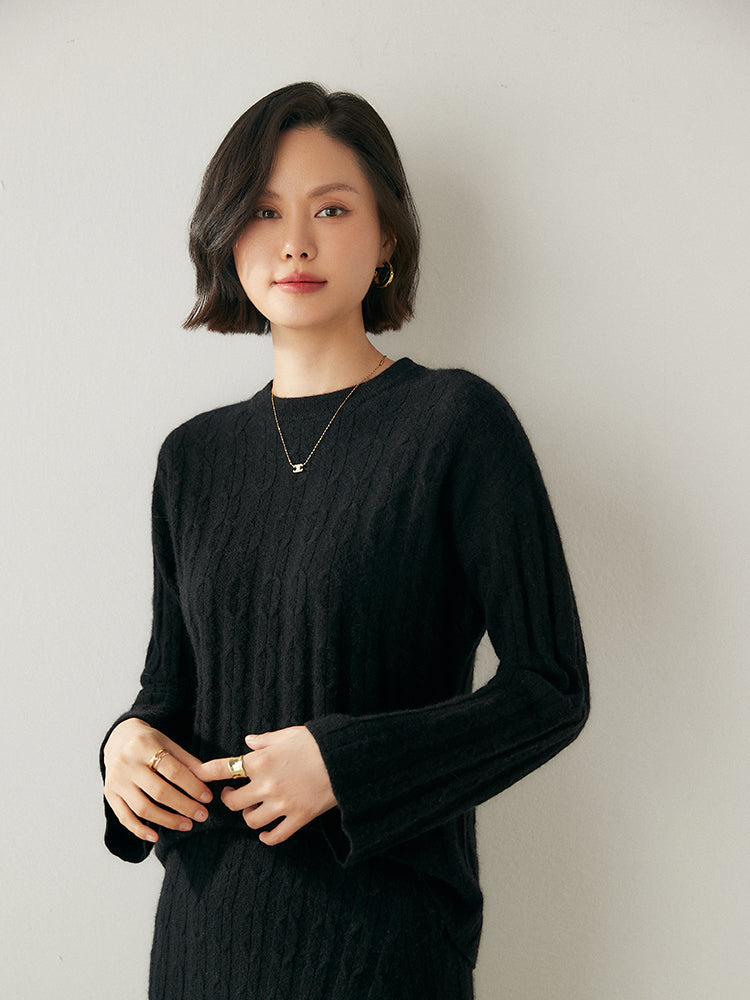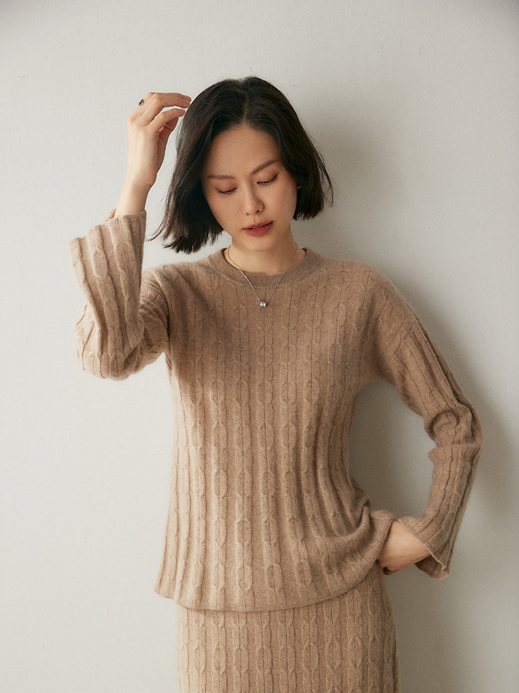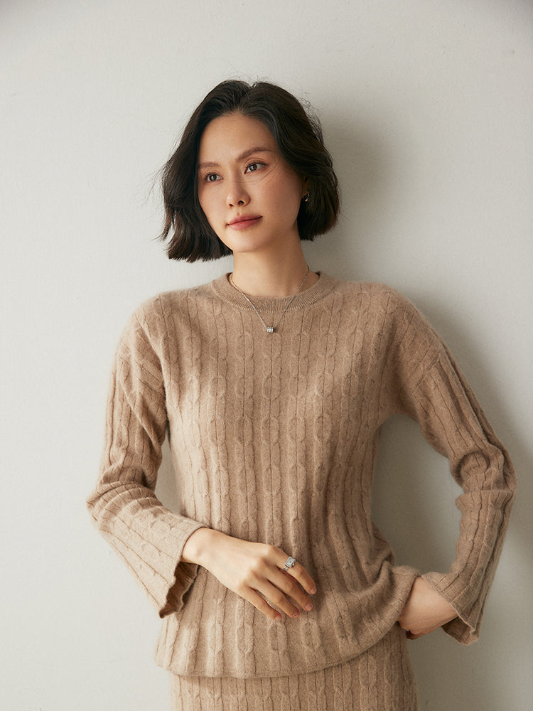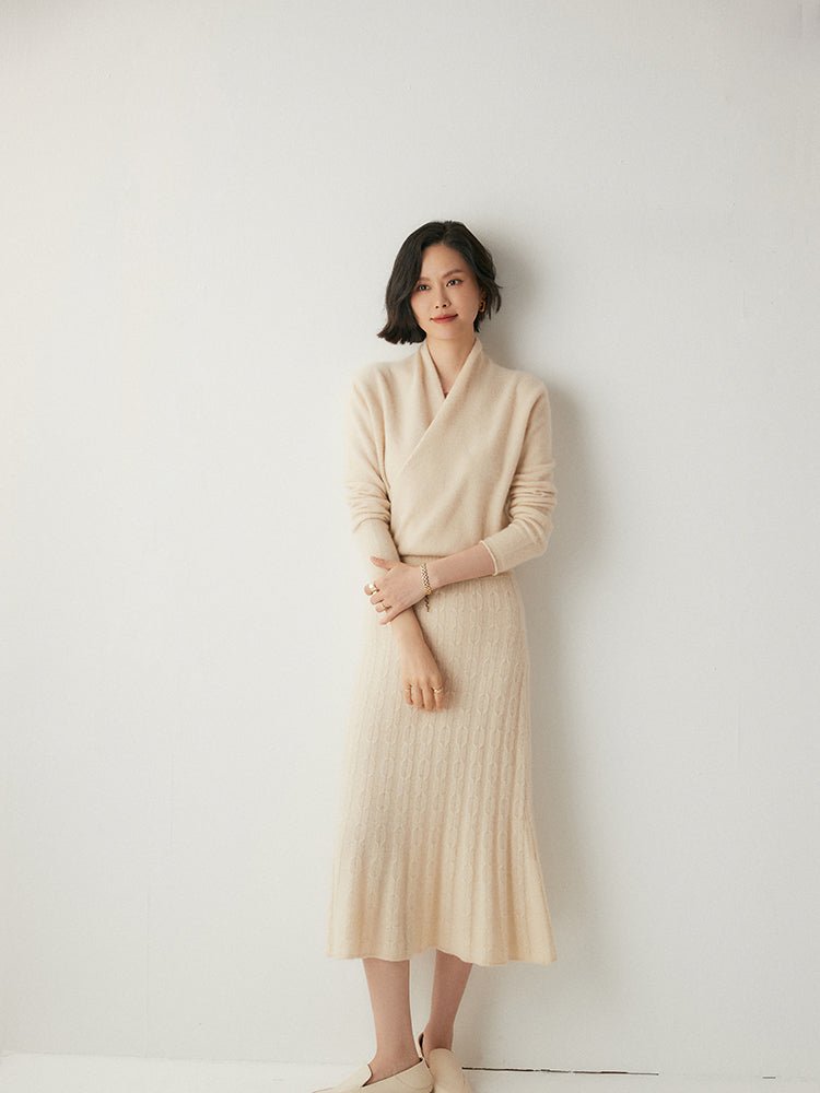 Experimenta la combinación perfecta de elegancia y comodidad con el conjunto de punto Volan Luxe, confeccionado con 35 % cachemira y 65 % lana para una sensación de lujo. El jersey de cuello redondo y la falda midi con cintura elástica están adornados con delicados dobladillos acampanados que añaden un toque de sofisticación y alegría a tu look. Su textura suave y su diseño chic lo hacen ideal para todo, desde días informales hasta ocasiones especiales. Llévalos juntos o por separado para crear estilos versátiles. ¡Una prenda imprescindible para quienes aman la elegancia natural!
