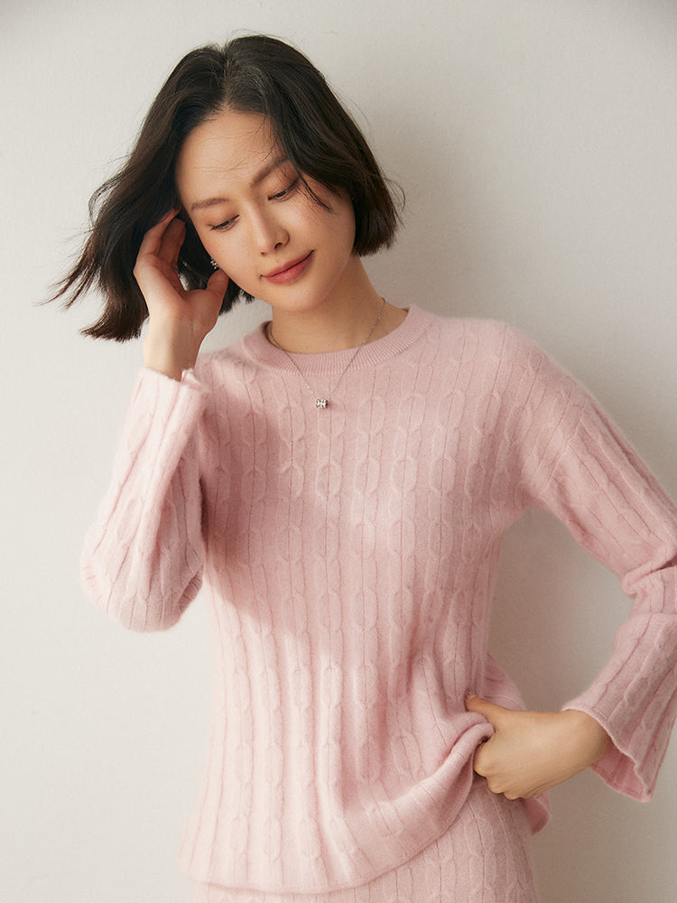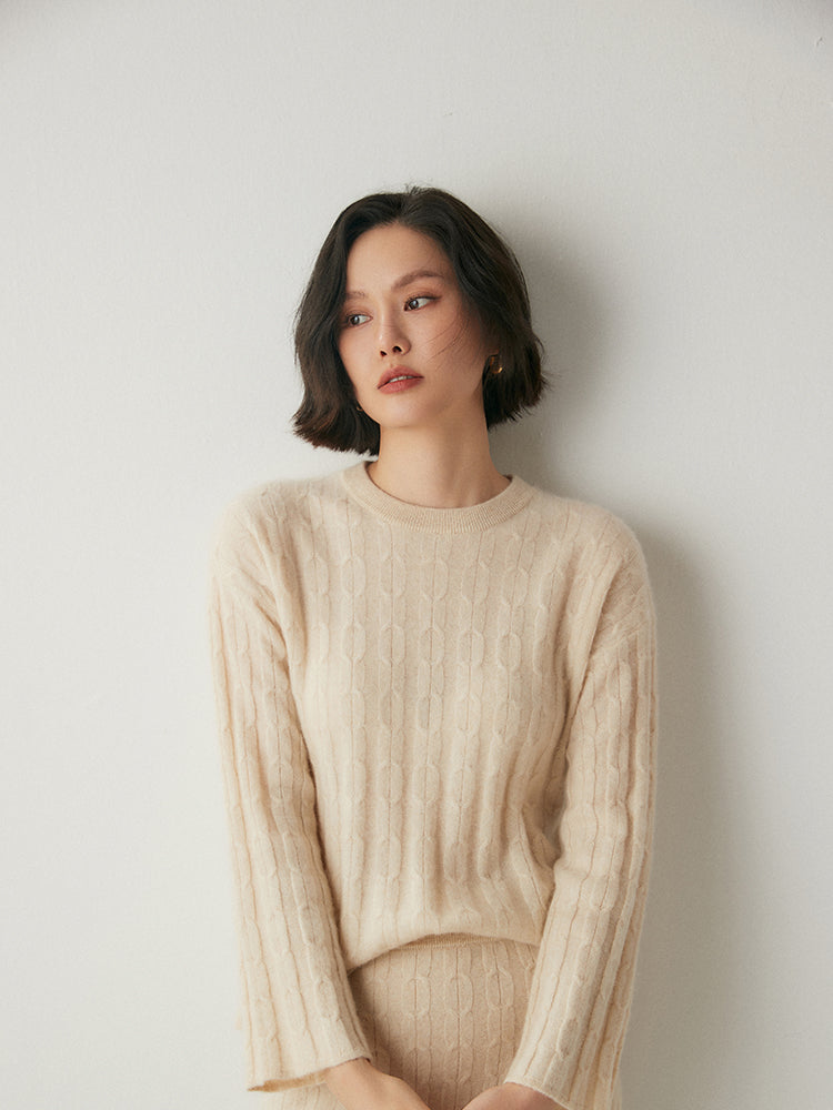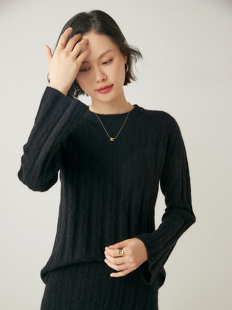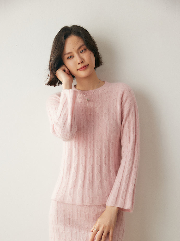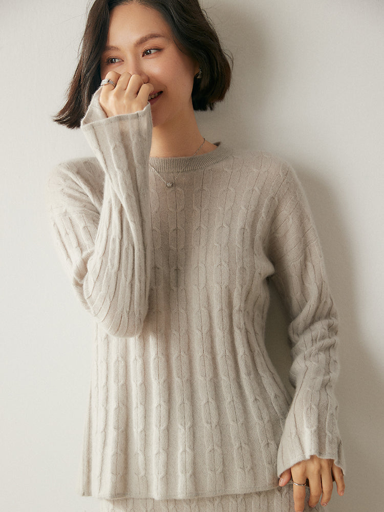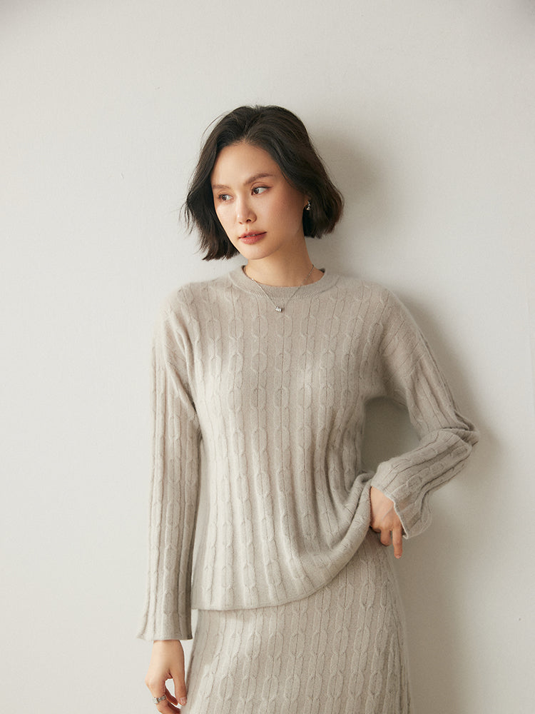 Experimenta la combinación perfecta de elegancia y comodidad con el conjunto de punto Volan Luxe, confeccionado con 35 % cachemira y 65 % lana para una sensación de lujo. El jersey de cuello redondo y la falda midi con cintura elástica están adornados con delicados dobladillos acampanados que añaden un toque de sofisticación y alegría a tu look. Su textura suave y su diseño chic lo hacen ideal para todo, desde días informales hasta ocasiones especiales. Llévalos juntos o por separado para crear estilos versátiles. ¡Una prenda imprescindible para quienes aman la elegancia natural!